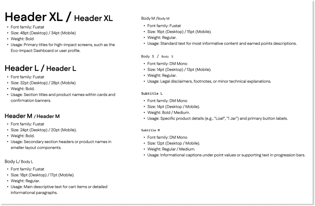• Typography: Hierarchical text styles for headings, body, captions, and buttons, optimized for readability on desktop and mobile.